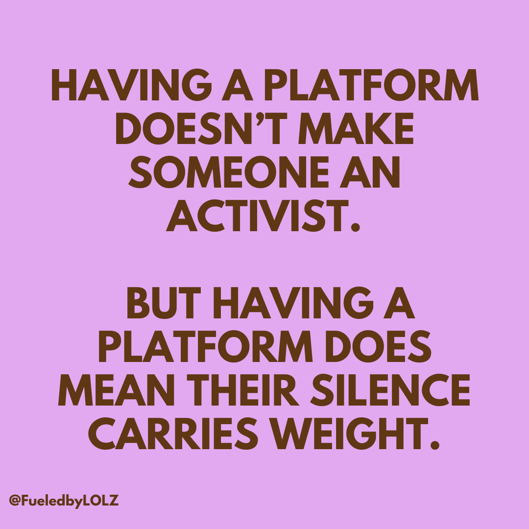 At the same time, I want to be very clear about something that gets muddled online. Influencers are not required to speak out. Having a following does not make someone a journalist or an activist. Some people are not informed enough to speak responsibly. Some are just trying to survive their own lives. Some people could be reprimanded at work for speaking out.