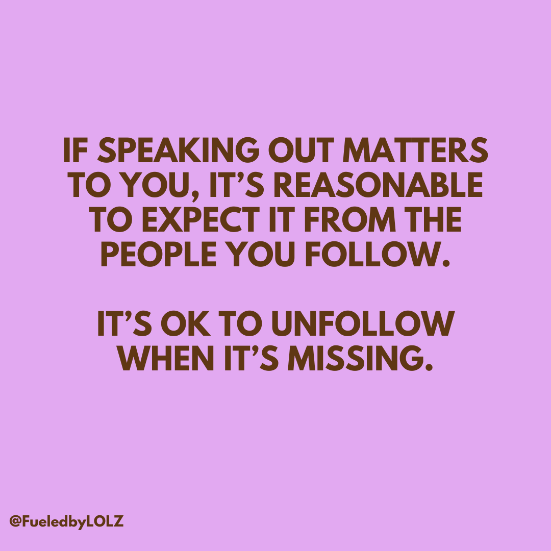 If speaking out is important to you, then you should consider who you are following. If that person hasn’t spoken out and you believe it matters, ask yourself this: are you really following someone for who they are, or for the ideal version you want to see?