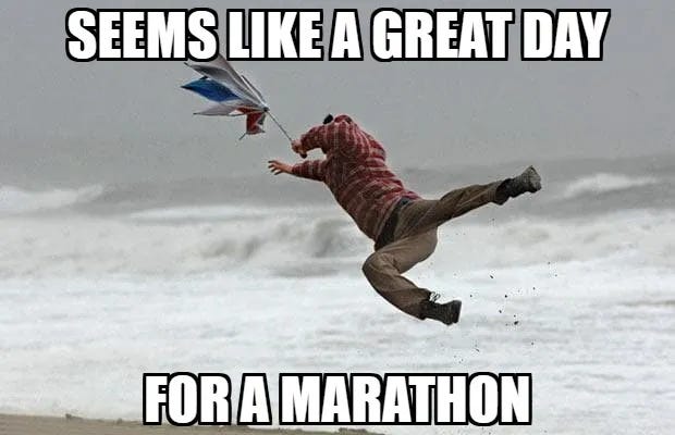 If you aren't running a race, consider the treadmill. Running into strong winds can take a toll on your body and hinder recovery. Sometimes running on the treadmill is more enjoyable and safer. Yes, you can't control the weather on race day, but sometimes a treadmill run will result in a more quality run than running outside.